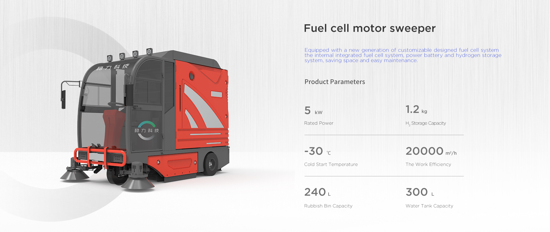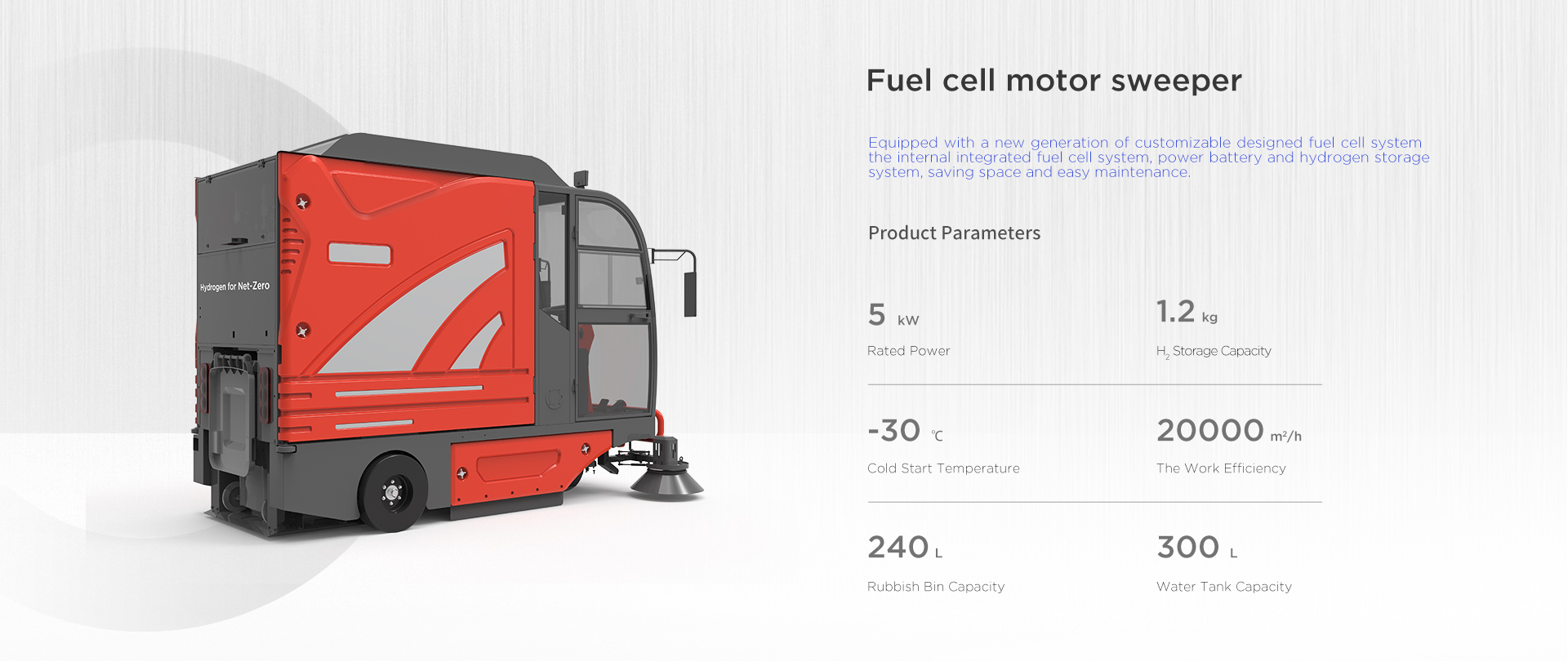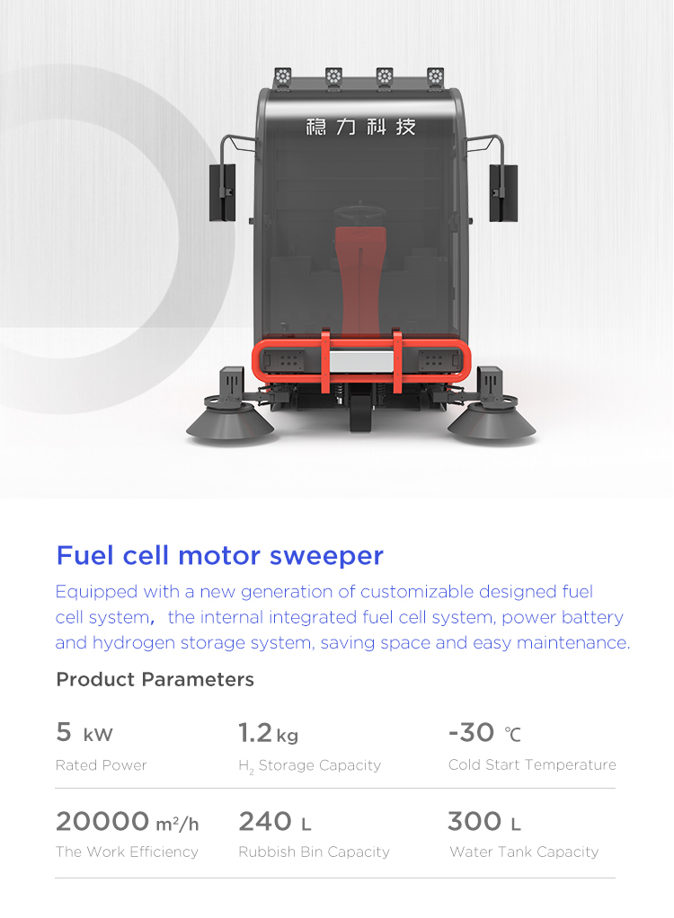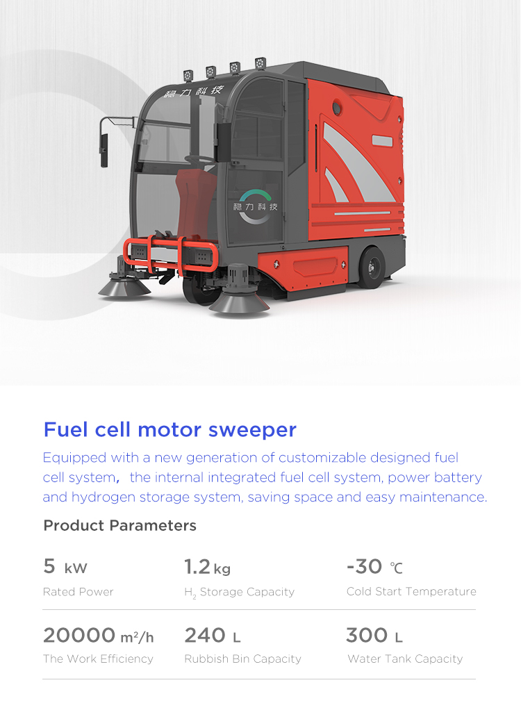 The new generation fuel cell system of sweeper can be customized developed and designed. It integrates the fuel cell system, power battery and hydrogen storage system, saving space and easy maintenance. Refilling hydrogen in 3 minutes, working for 6 hours, low noise and zero emission.