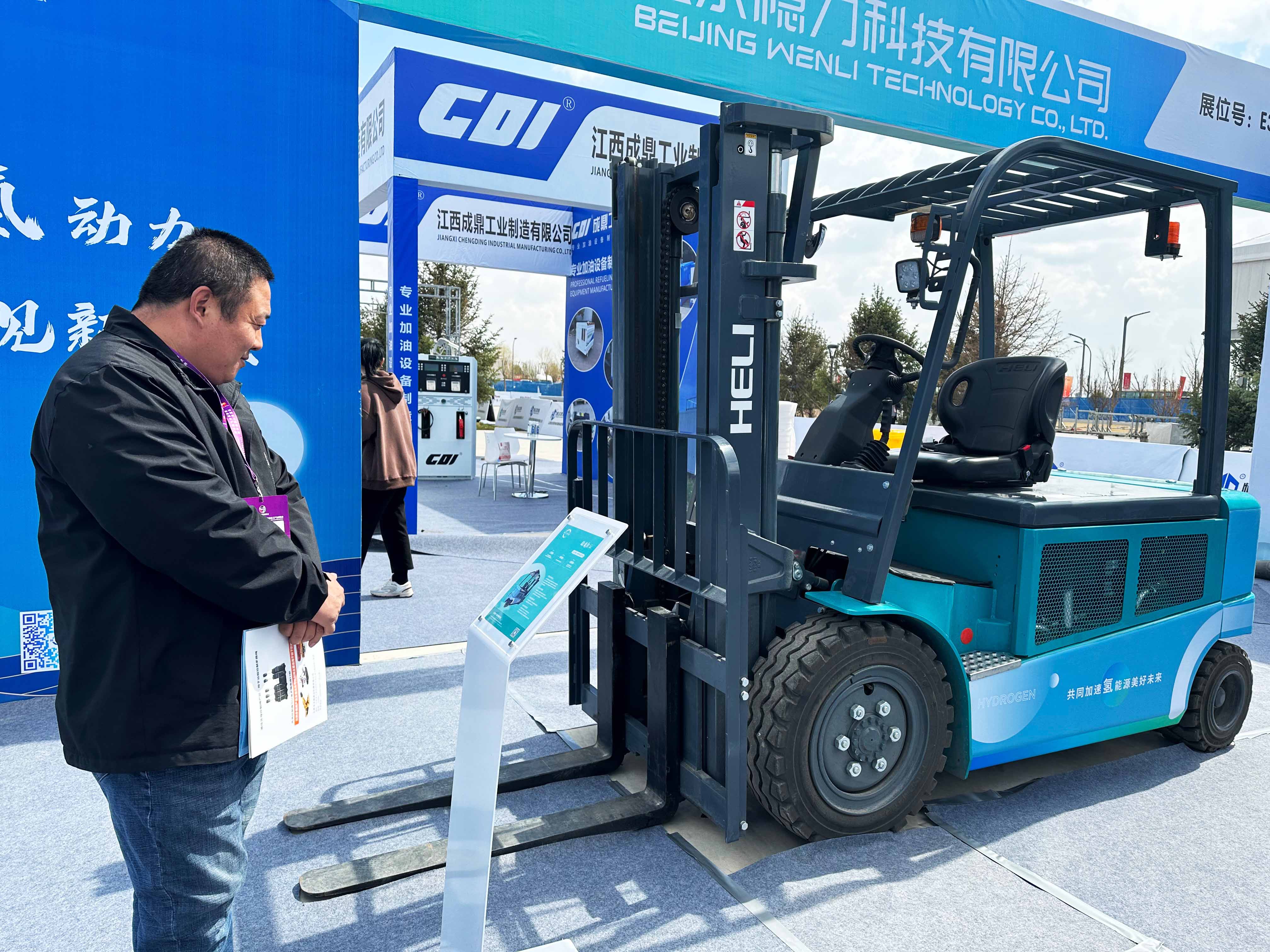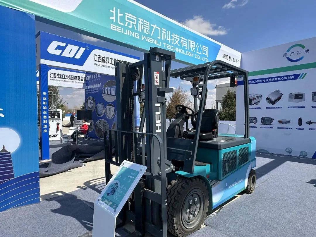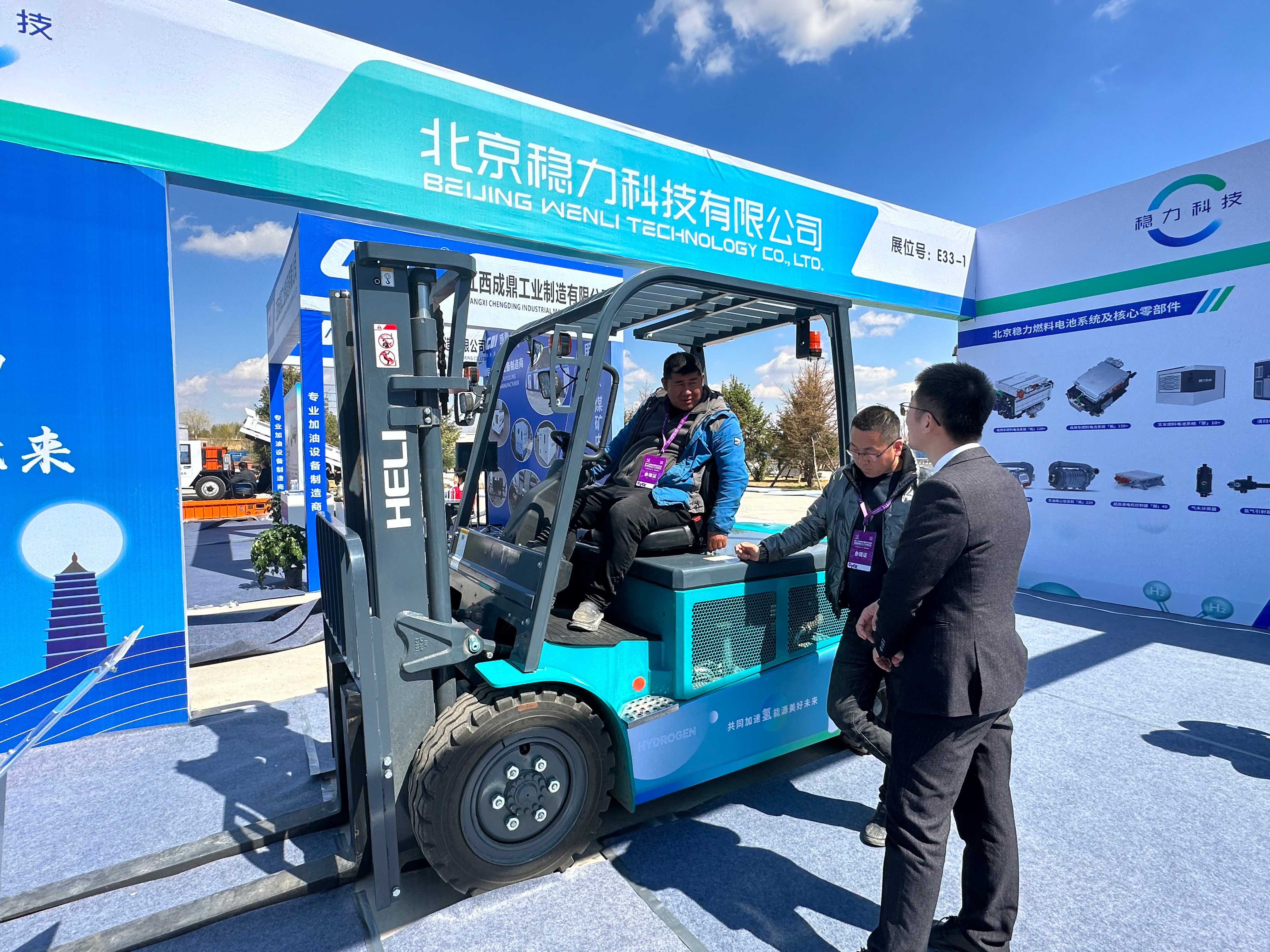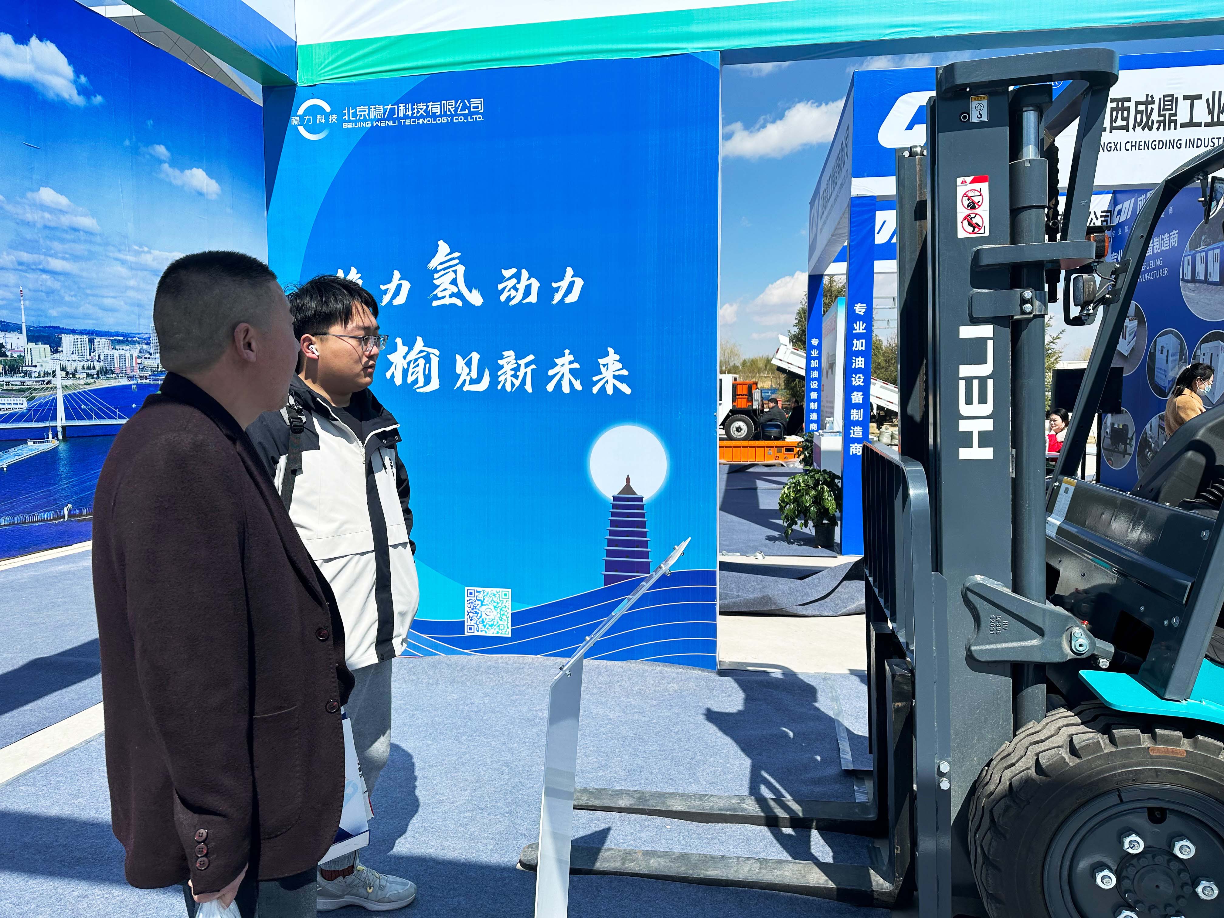 在重型裝備展區,北京穩力攜49噸氫能重卡、新一代燃料電池叉車等新產品重氫出擊,首次亮相第十七屆榆林國際煤博會。在E33展位,一位酷颯有型的藍色“氫燃大物”成為展會現場的亮眼焦點,吸引無數觀眾駐足觀摩與交流。